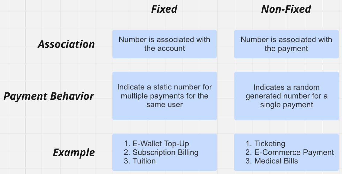 In a non-fixed virtual account, a unique account number is assigned to each payment. This type of virtual account is usually used for a one-time payment for a product or a specific service. For a non-fixed virtual account generation, digits will be randomly generated for each payment.