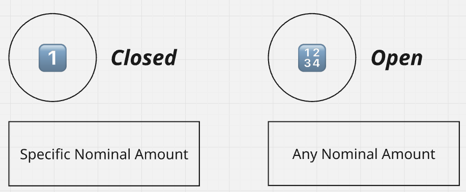 Open types accept payments in any nominal amount. This type is used mainly on top-up services in e-wallets, customers are able to pay in any given amount.