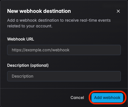 Step 2 — Enter a valid HTTPS endpoint URL and an optional description, click Add Webhook